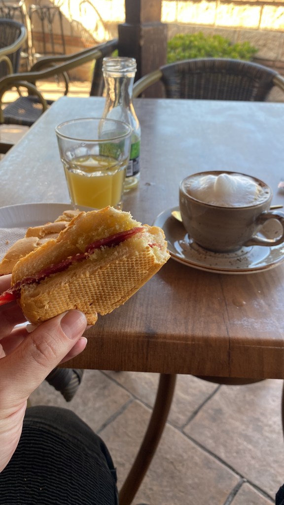 Je to přesně ten typ podniku, kam byste náhodou nezajeli, ale jednou objevíte a pak se vracíte. Často tu potkáte skupinky britských seniorů, kteří se sem zjevně přestěhovali na důchod. Dámy probírají společné večeře – kdo co uvaří nebo nachystá – chlapi řeší ryby, sport a typické chlapské záležitosti. Prý zrovna nevaří, ale jelikož mám hlad, něco vymyslí. Dostanu čerstvě rozpečenou housku s jamónem, kafe a pomerančový džus. Ráno nemohlo začít lépe. Pokud se tu zdržíte déle, zkuste zapečené artyčoky s jamónem – lehké jídlo, ideální na další kilometry. Obsluha navíc mluví slušně anglicky, což se v zapadlých vesnicích hodí.