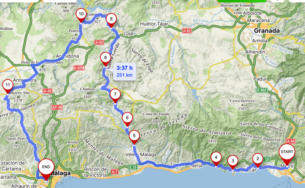 Za Villanueva de Tapia uhýbám vlevo na menší MA-5102 pro další dávku zatáček, než se napojím na A-92. Na výjezdu 152 sjedu krátce na A-45, a pak na výjezdu 102 mířím směrem na Antequeru. Antequera je jedno z těch měst, která mají zvláštní váhu – starobylé centrum Andalusie, pevnost Alcazaba nad městem a v okolí megalitické dolmeny zapsané na seznamu UNESCO. Antequera je přirozenou křižovatkou Andalusie – geograficky i historicky. Projíždím centrem na jih po A-7075 a hned se stáčím východněji do kopců po A-343.